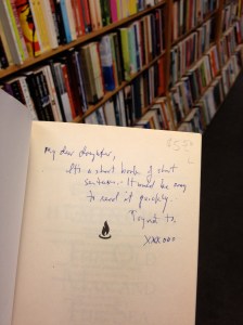 I came across this inscription in a Harvard bookstore’s used section. It seems to be advice that a father is writing to his daughter about reading the short, simple book, “Old Man in the Sea.” The advice resonates me with not only as words of wisdom about the book, but also as guidance to live by. Slow down. Enjoy. Savor the space between the words, the meaning tucked into the simplicity.